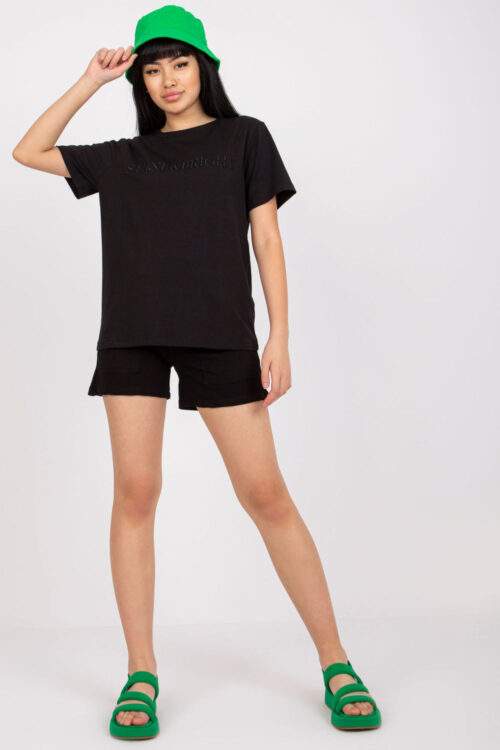 Ladies set consisting of a t-shirt and shorts. T-shirt with short sleeves, round neckline. High waisted shorts with slip pockets on the sides. Shorts with elastic waistband and ties. Cotton 90 % Spandex 10 % Size Lenght Chest Waist one-size-fits-all…