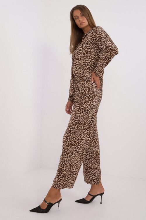 Women’s set with a fashionable animal motif, consisting of a shirt and pants, made of a combination of polyester and elastane. The shirt has long sleeves and is buttoned, giving it a classic character. Additionally, it is equipped with a…