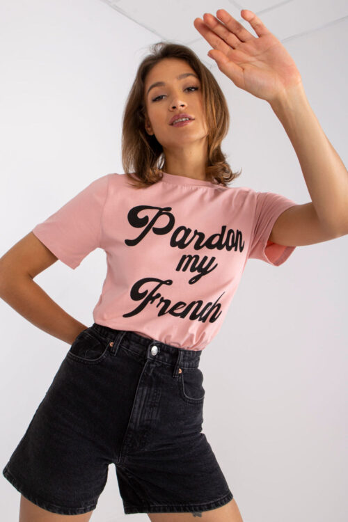 Ladies short sleeve T-shirt. Decorative inscription on the front. Perfect for everyday wear. Cotton 95 % Lycra 5 % Size Total length Chest one-size-fits-all 65 cm 96 cm