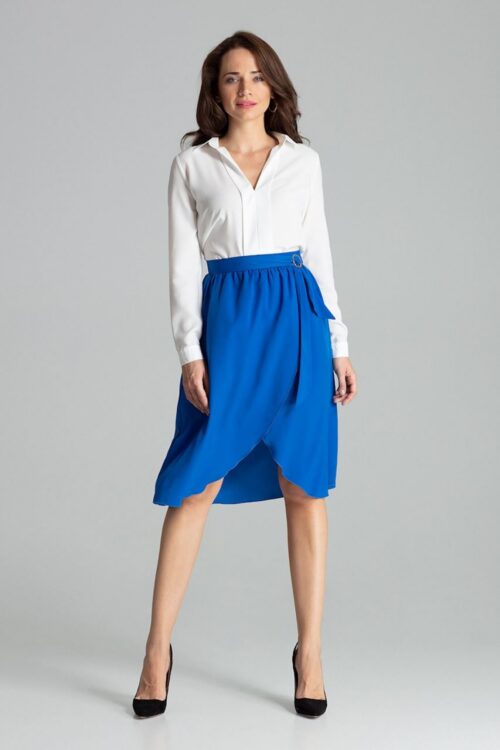 Blue midi skirt with no pockets and no lining. A front overlap on the left leg with decorative buttons. Covered zip at the side, decorative tie belt. Polyester 100 % Size Lenght Hips width Waist width L 65 cm 106…