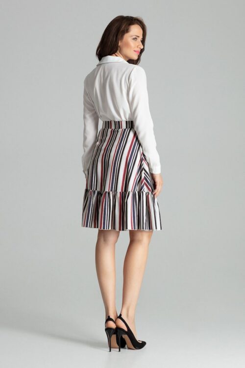 Striped midi skirt with a waist seam and a covered side zip. Envelope skirt front. At the front a belt with a decorative metal buckle in gold. Dress unlined and without pockets. Spandex 5 % Polyester 95 % Size Lenght…