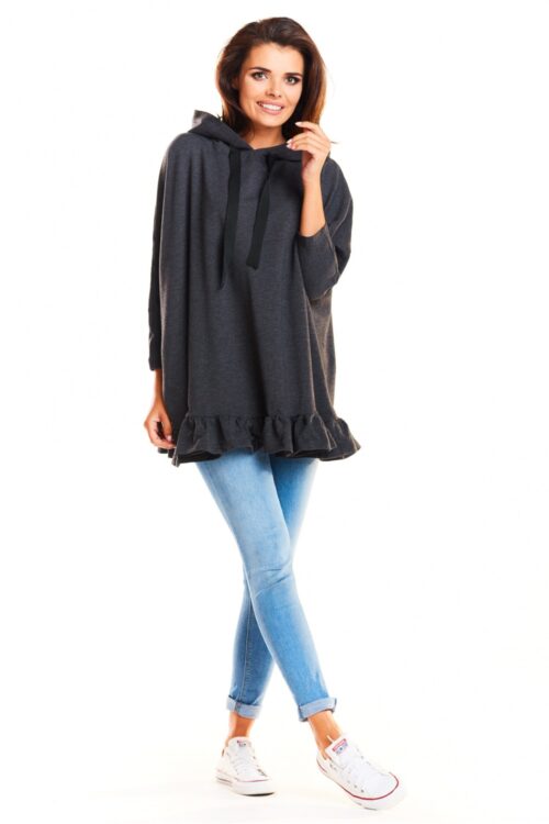 Women’s sweatshirt with a loose fit in graphite colour. Hooded sweatshirt with a zip. Hooded sweatshirt perfect for many stylings. Cotton 95 % Spandex 5 % Size Chest L/XL 94-101 cm S/M 86-93 cm