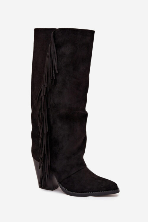 Cowboy boots for women, made of faux suede, are a fashionable proposition for many stylizations. The column-shaped heel provides comfort, and the zip closure makes it easy to put on. Pointed toes. Fringes on the side of the upper add…