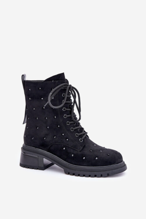 Women’s ankle boots made of eco suede are a charming proposal combining comfort with a fashionable detail. The lace-up and zip closure model ensures easy putting on and perfect fit to the foot, while the decorative heart with crystals on…
