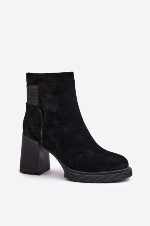 Women’s ankle boots made of eco suede. Mounted on a stable pillar-shaped heel. The inside is insulated with a shoe blanket, providing warmth and comfort when wearing. This model is fastened with a zipper, making it easy to put on…