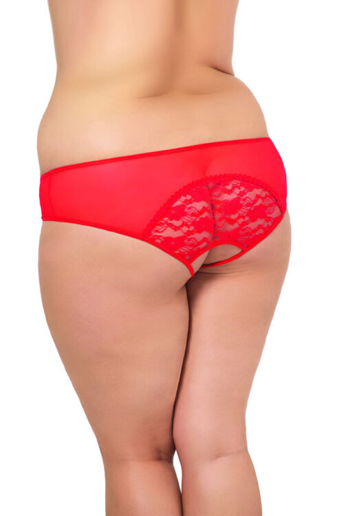 Panties made of lace with floral patterns. On the back deep cut-out, sexy uncovering buttocks. Panties of open crotch type. Model from Plus Size collection. polyamide 100 % Size Hips width XL 108-114 cm XXL 116-122 cm XXXL 124-128 cm