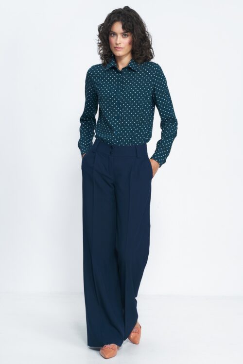 A casual women’s shirt is the perfect everyday proposition for women who value comfort combined with timeless style. Made of high-quality cotton, it provides comfort, breathability, and a pleasant feeling of lightness throughout the day. The smooth material gives it a universal character and makes the shirt easily fit into various stylizations. The short cut and short sleeves make it an excellent choice for warmer days, and the classic collar adds elegance to the casual look. The button closure hidden under a covered placket emphasizes the minimalist design and ensures an aesthetic appearance. An additional advantage is the practical pocket placed at chest height, giving the shirt a slightly utilitarian character. The shirt will work great in everyday stylizations, both paired with jeans, skirts, or shorts. It is a versatile wardrobe piece that combines functionality, comfort, and a fashionable, casual style.
