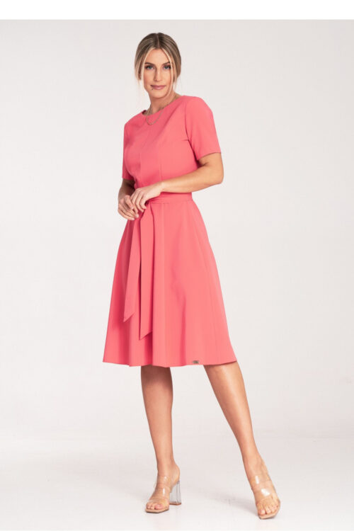 Classic midi dress with pleats and short sleeves. Tied at the waist with a fabric belt, fastened at the back with a hidden zipper, boat neckline. Polyester 65 % Viscose 35 % Size Lenght Hips Chest Waist L 106 cm…
